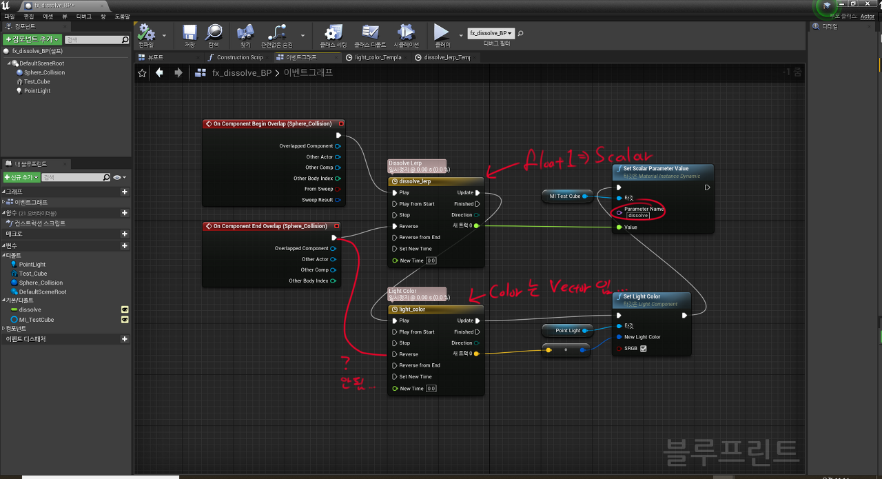 이 경우는 On Component Begin Overlap의 노드를 위쪽 dissolve_lerp에 연결 해놔서 그런 것. 시작, 끝을 모두 light_color 타임라인에 꼽으면 잘 작동함.