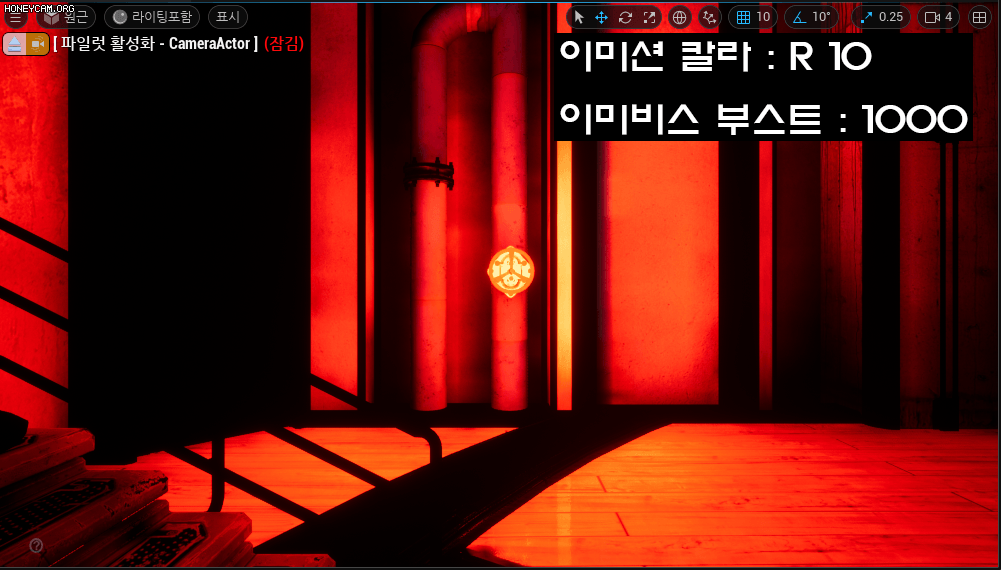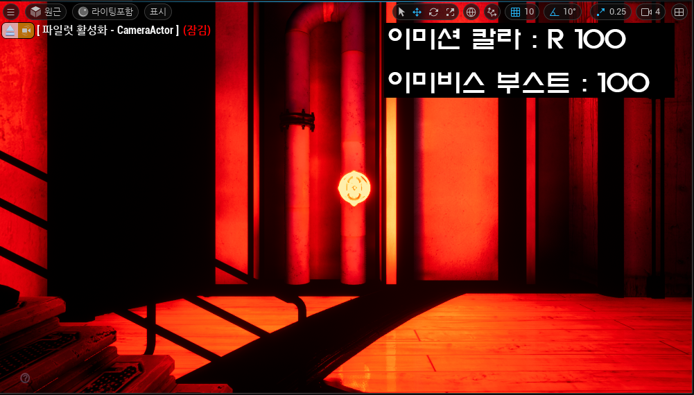- Bloom 효과로 인하여 발광하는 것 같이 보이지만, 다른 오브젝트(Static Actor)에 Static Light로 Light Build(Bake) 후, 적용됨.