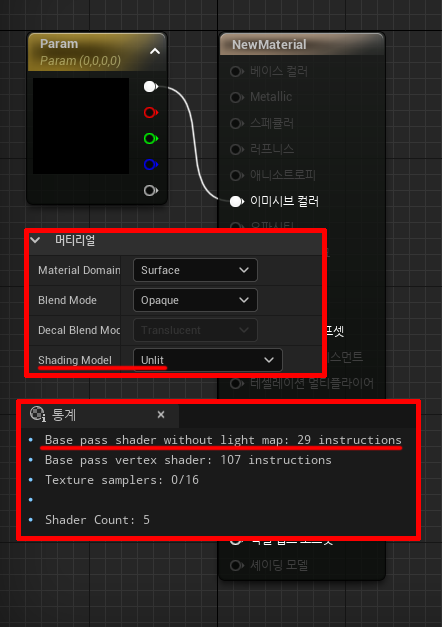- Emissive light의 경우, 자채발광으로 Light source의 성향을 띄기 때문에, 다른 Light의 영향을 받을 필요가 없다. 그래서 Material의 Shading Model을 Lit에서 Unlit으로 하면 Shader Instructions을 낮출 수 있음.