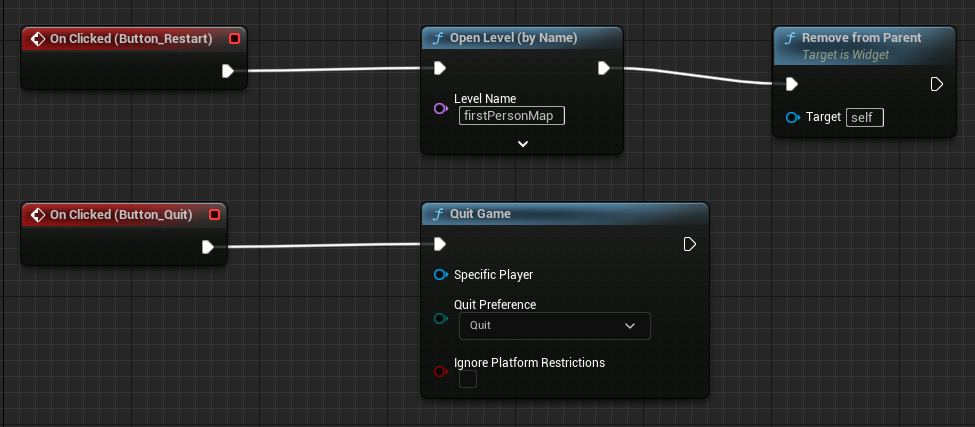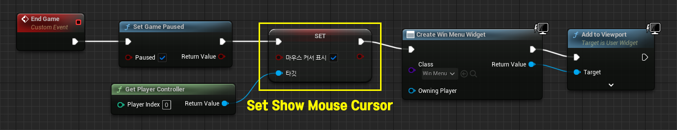 그다음 FirstPersonCharacter의 블루프린트에서 End Game이라는 Custom Event 노드를 생성하여, 조건이 클리어 되면, 게임을 멈추고, 마우스 커서를 이용할 수 있으며, 위 UI 창이 뜨도록 노드를 구성한다.