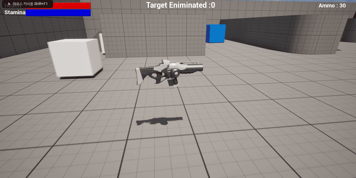 - 탄창의 총알을 모두 소비 하면 총이 발사 되지 않는다. 그렇기 때문에 총알을 충전할 수 있는 아이템을 만들어 레벨에 배치한 후, 유저가 이 아이템을 통하여 총알을 충전 할 수 있도록 한다.