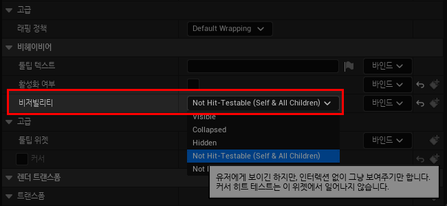 UI - Text의 디테일 창에서 비저빌리티 관련 설정을 변경하면 이제 Text는 그냥 비쥬얼적으로 보여줄 뿐, 버튼 위를 막는 이미지가 아니게 된다.