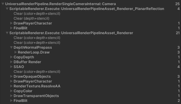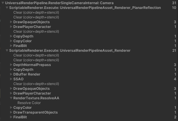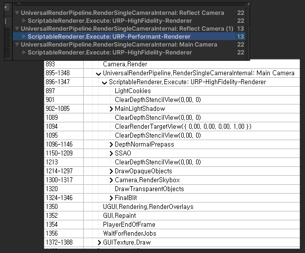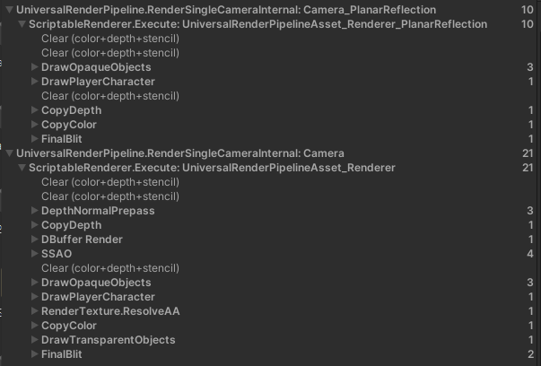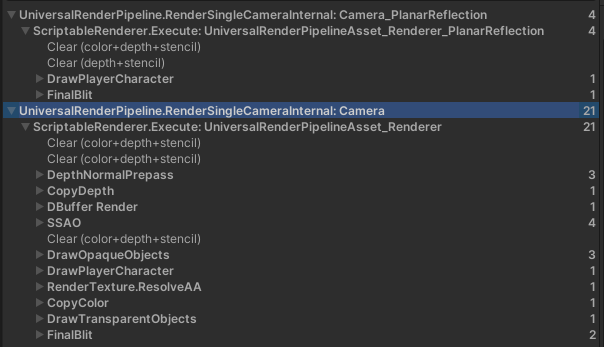 - "메인 카메라와 반사용 카메라를 통합하면 중복 렌더링이 없을 수 있을 것 같다."라는 가설이 떠올라 확인 카메라를 통합하였다. 결과적으로 이것은 효과가 없었다. 프레임 디버거로 이 과정을 확인하였는데, 카메라가 통합되어 있어도, 같은 작업을 반복 수행하고 있었다.