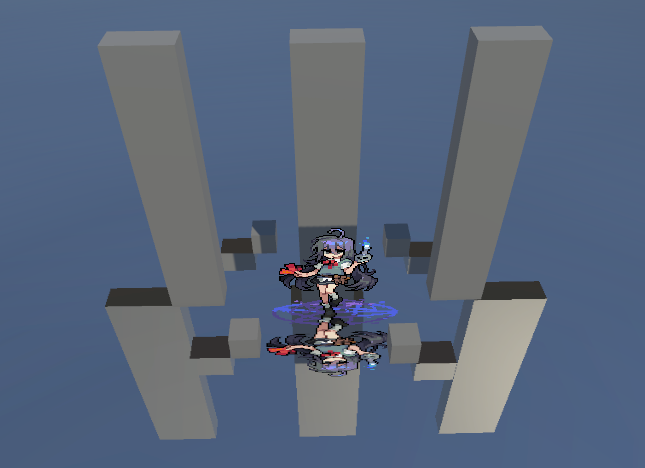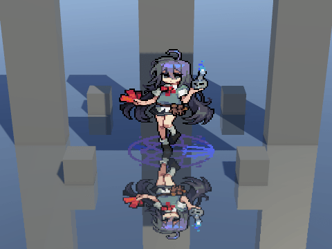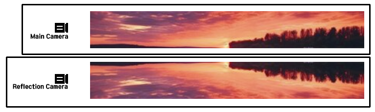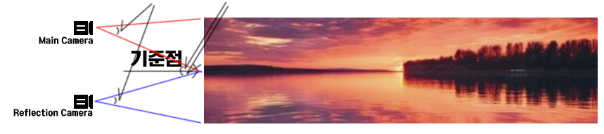 위의 이미지와 같이 만들기 위해서 메인 카메라를 기준으로 리플렉션 카메라의 포지션 Y 값을 음수로(기준이 0일 경우), 로테이션 Z 값을 180회전, Y 값은 Flip 시킨다.
