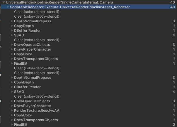 - 다음으로 진행한 것은 각각의 카메라에 렌더러를 분리해 보았다. 그리고 이 역시 프레임 디버거로 잘 분리된 것을 확인하였다. 최종적으로 드로우콜은 위와 차이는 없었지만 좋은 선택이었다.