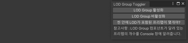 - Scene 안에 배치된 오브젝트들의 LOD Group 컴포넌트 활성/비활성 토글