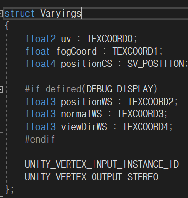 버텍스 정보를 프레그먼트 셰이더에게 넘기기 위한 구조체입니다. 이 외에도 다른 용도가 있는데, 뒤에서 설명하겠습니다.