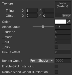 위 셰이더를 메테리얼에 연결 해주고, 메테리얼을 확인하면, 인스팩터에서 하단에 첨부한 이미지와 같은 값을 수정할 수 있는 옵션들(변수)를 볼 수 있습니다.