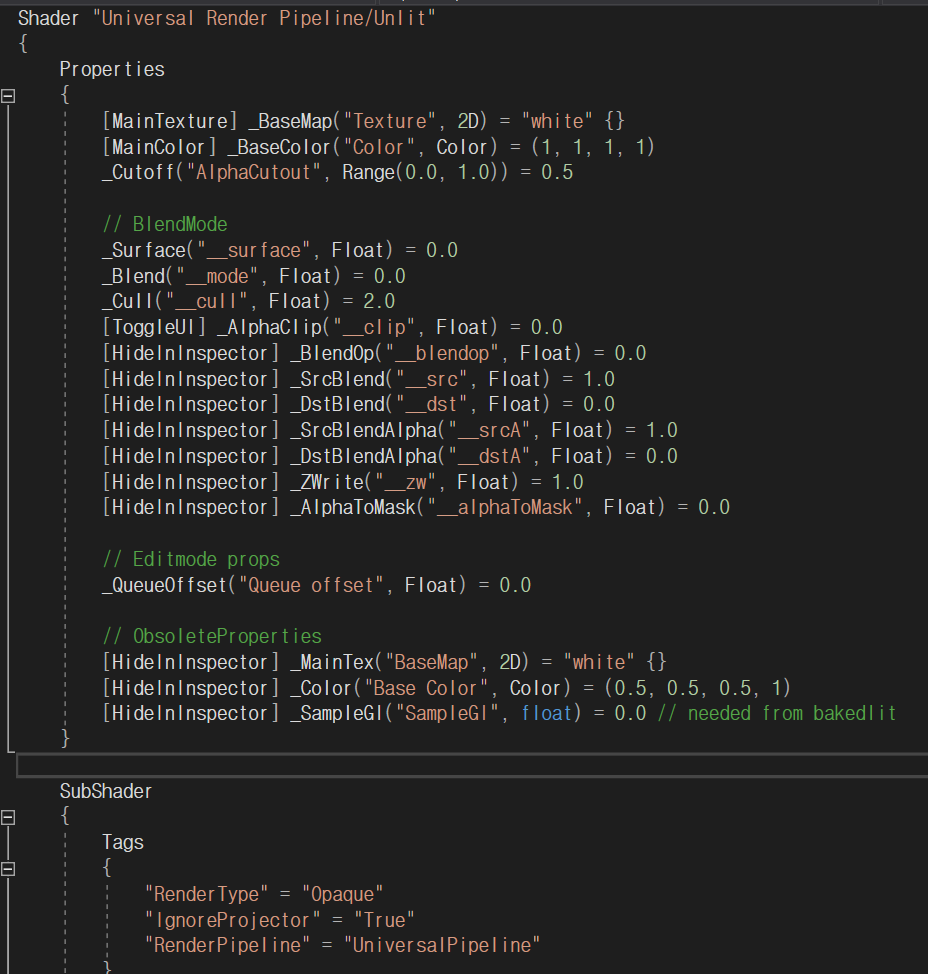Unlit.shader 파일을 열면 하단에 첨부한 코드 이미지와 같이 엄청나게 긴 코드 블럭이 나옵니다.