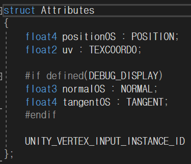 이름에서 볼 수 있듯이 vertex는 버텍스 셰이더를 뜻하며 뒤쪽에 있는 UnlitPassVertex가 버텍스 셰이더 부분의 이름입니다.