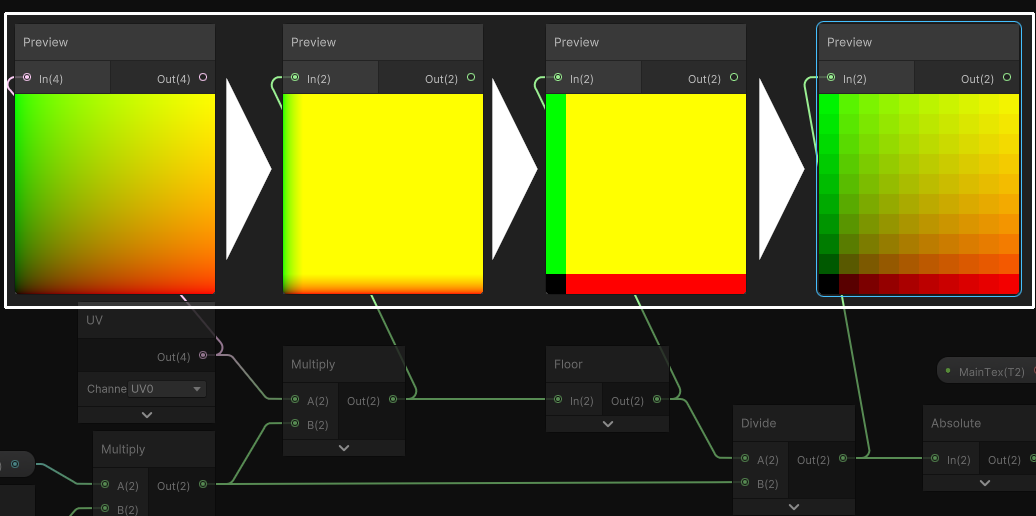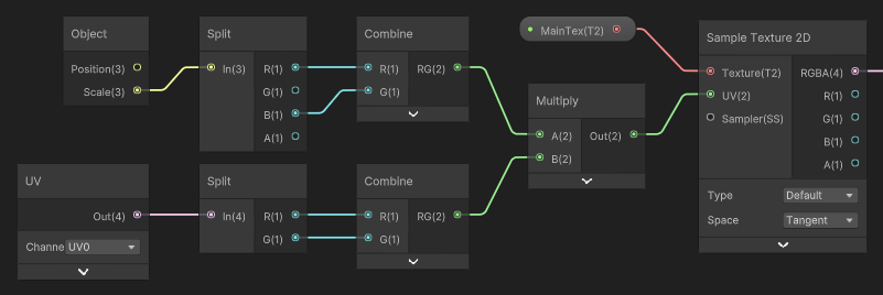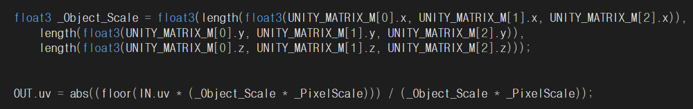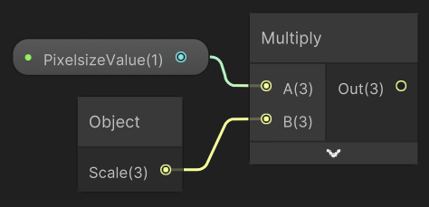 우선 픽셀 사이즈를 내가 정할 수 있도록, 오브젝트의 스케일과 픽셀 사이즈를 정하는 변수를 곱해줘야 한다. 곱연산의 특징산 UV에 곱해줘도 되지만, 연산을 한 번만 하기 위하여 이렇게 곱하였다.