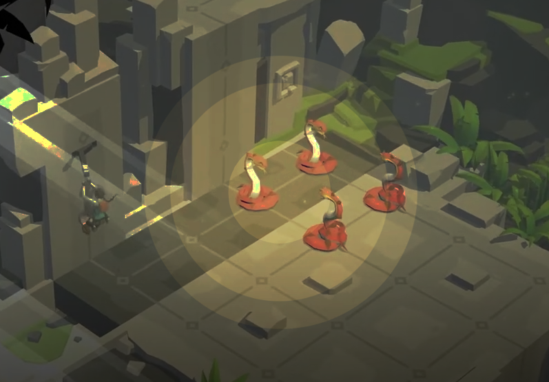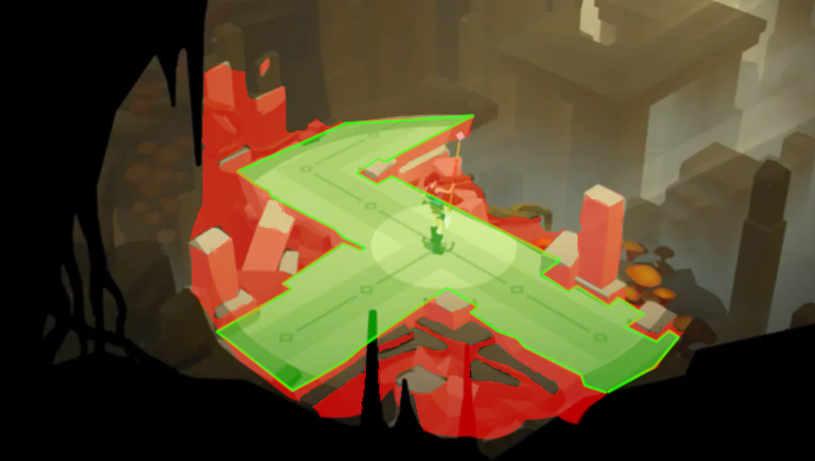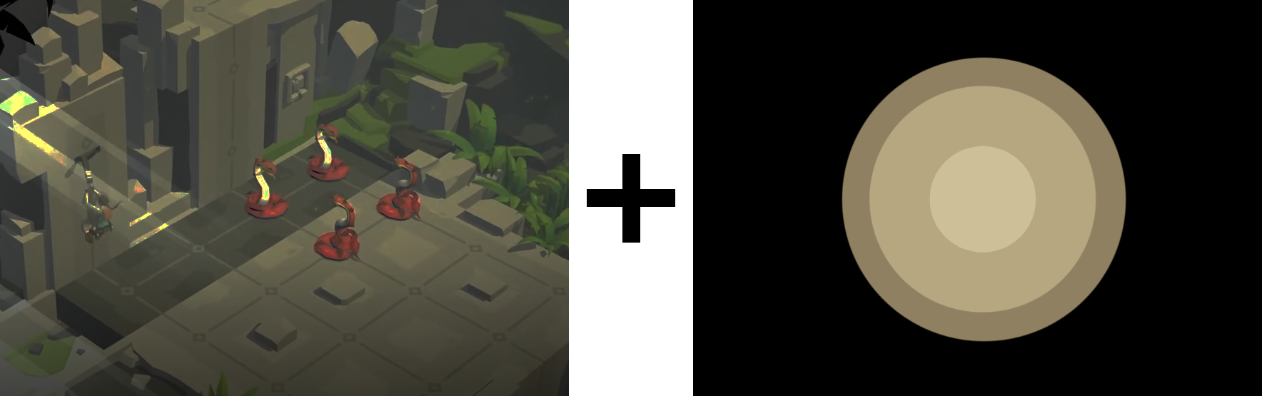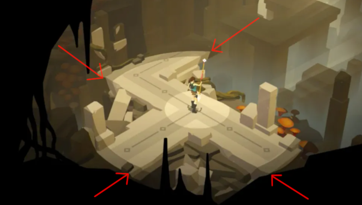 - 빛에 대한 밝기의 단계, 빛이 미치는 범위의 경계가 로우 폴리곤의 그래픽에 맞춰 칼 갈이 끊어진다.