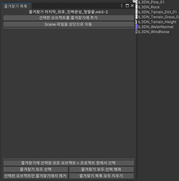 [SCRIPT] Favorites List 기능 프로젝트 창의 모든 오브젝트를 즐겨찾기 할 수 있다. 버튼, 드래그 앤 드랍으로 즐겨찾기에 등록이 가능하다. 즐겨찾기에 등록된 오브젝트들을 프로젝트 뷰에서 검색 및 이슈화 시켜준다. 즐겨찾기가 많아질 수 있고, 유니티 에디터를 직접적으로 접하지 않은 많은 아티스트들은 대부분 게임 테스트를 목적으로 하기 때문에 Scene에 한하여 로드, 플레이 기능을 넣었고, 즐겨찾기 목록에서도 최 상단으로 정리할 수 있게 했다. 코드 링크 : https://asatala.tistory.com/39