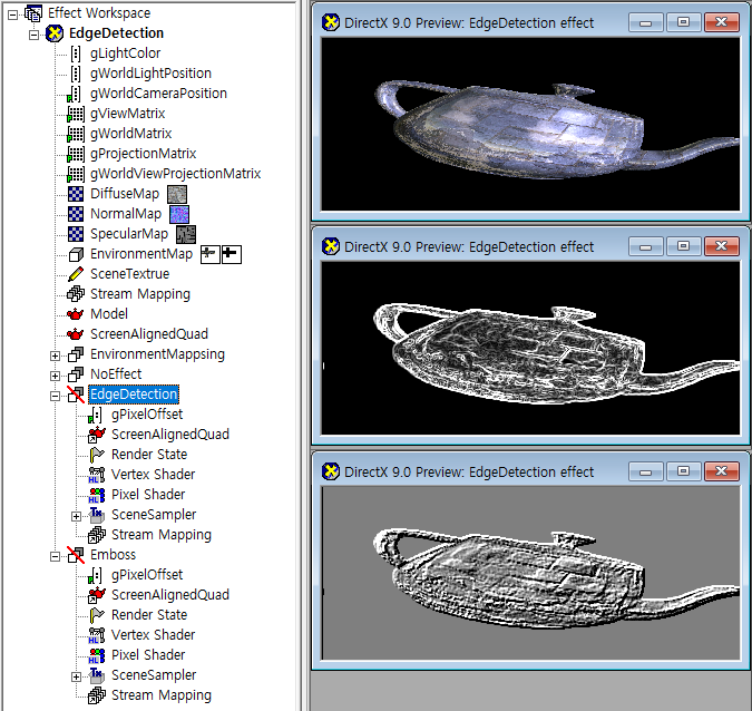 [RenderMonkey] Edge Detection// Vertex Shaderstruct VS_INPUT{ float4 mPosition: POSITION; float2 mUV : TEXCOORD0;};struct VS_OUTPUT{ float4 mPosition: POSITION; float2 mUV : TEXCOORD0;};VS_OUTPUT vs_main(VS_INPUT Input){ VS_OUTPUT Output; Output.mPosition = Input.mPosition; Output.mUV = Input.mUV; return Output;}// Pixel Shader// 외곽 검출struct PS_INPUT{ float2 mUV : TEXC..